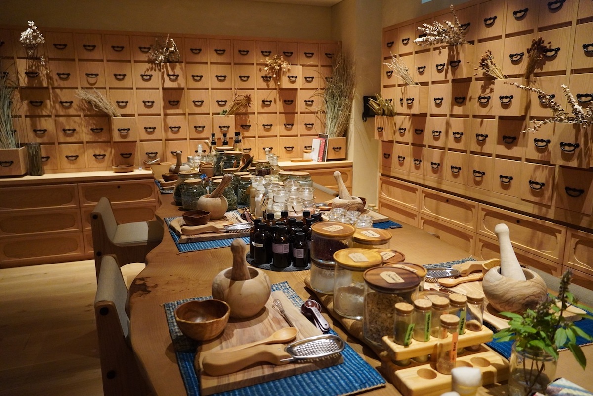 「アルケミーバー」では、自家農園で栽培されたハーブと天然由来の材料を使ったワークショップが開かれています。たくさんの薬草やハーブが並んでいて、ここにいるだけで自然の香りに癒やされます。