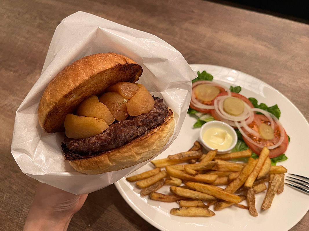 甘さ控えめの軟らかなリンゴと、肉肉しいパティの相性は抜群。