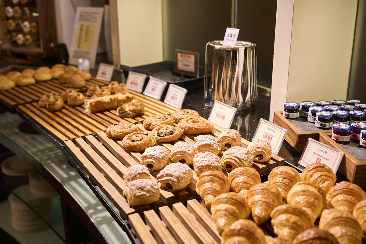 「ピエール・エルメ・パリ」のラインナップ以外にも、「パティスリーSATSUKI」の焼きたてパンやミニドーナツが10種類以上ずらりと並びます。もちろん、各種ジャムやホイップバターもあり、より自分好みの味で楽しむことができますよ。