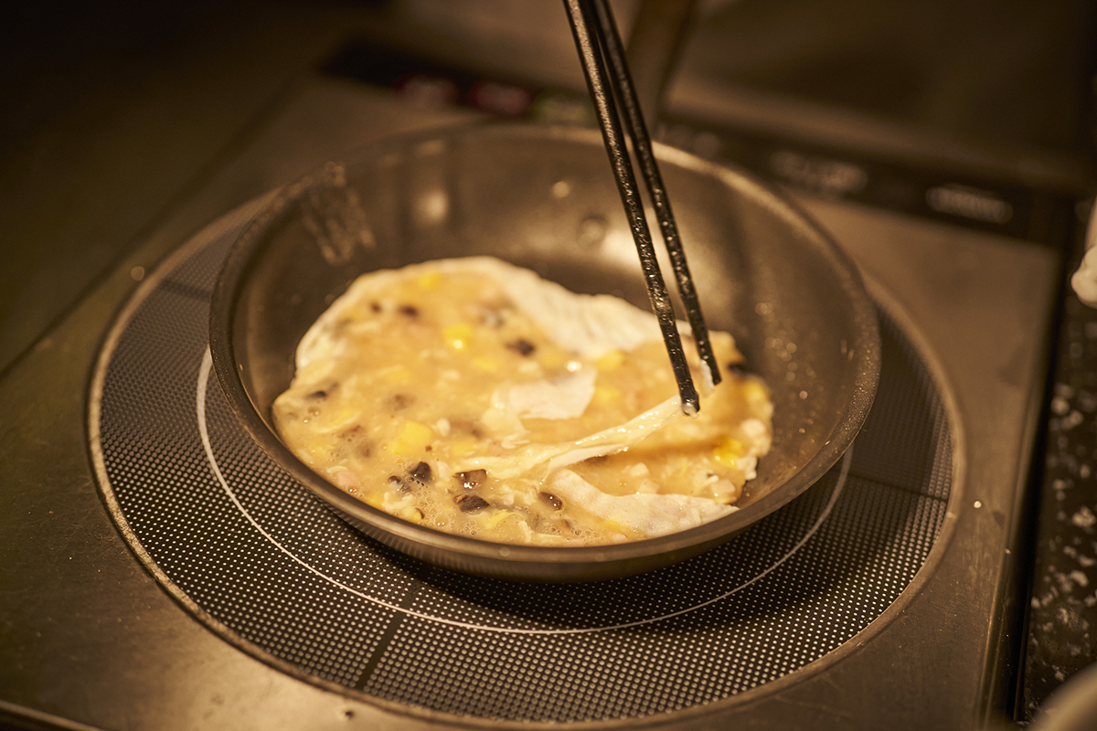 今回は特に人気だという、ハム、チーズ、マッシュルームを入れたオムレツを作っていただきました。