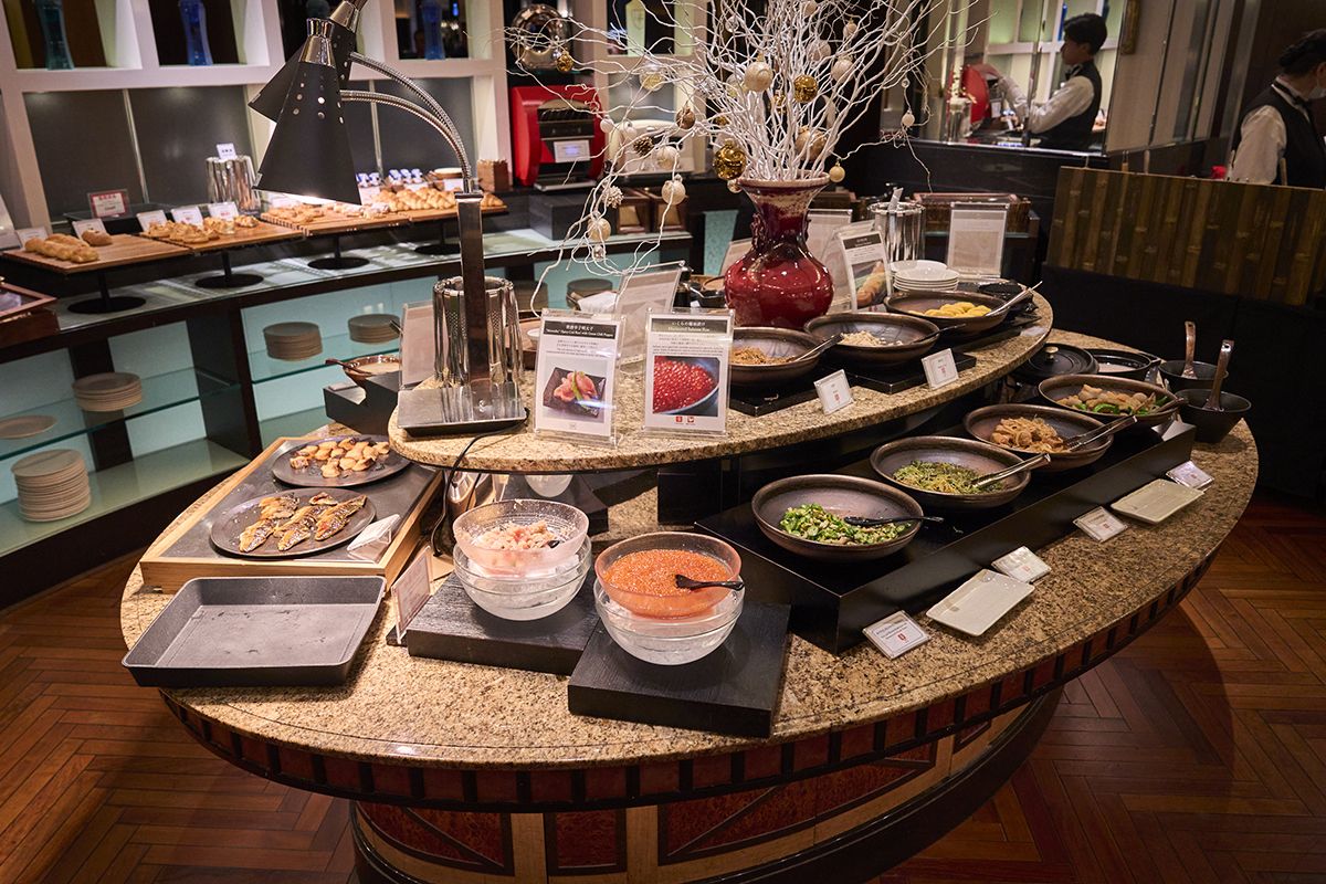 和食でチェックすべきは、おかずの数々が並ぶ、こだわりの和食 “極”(きわみ)です。天然塩で丁寧に仕上げた真アジの干物(サバの塩麹焼きと日替わり)、職人が作る国産大粒大豆のホテルオリジナルの納豆、最高級の紀州南高梅、塩麹で一日漬け込み軟かく焼き上げたタスマニアサーモンの塩麹焼、奈良産地酒の酒粕で漬け込んだ奈良漬……と、ひとつひとつこだわった逸品を少しずつ味わえます。品数が多いうえに、すべてがこだわりの一品なのです。