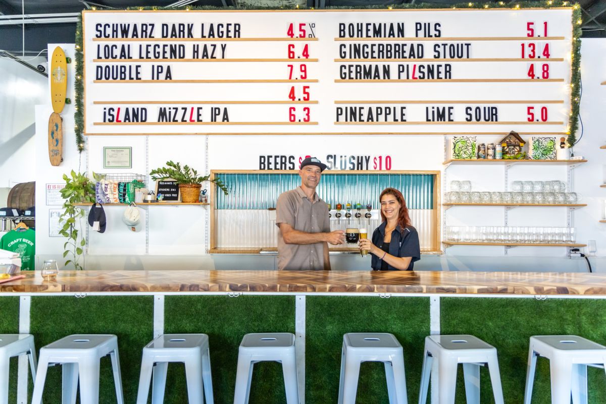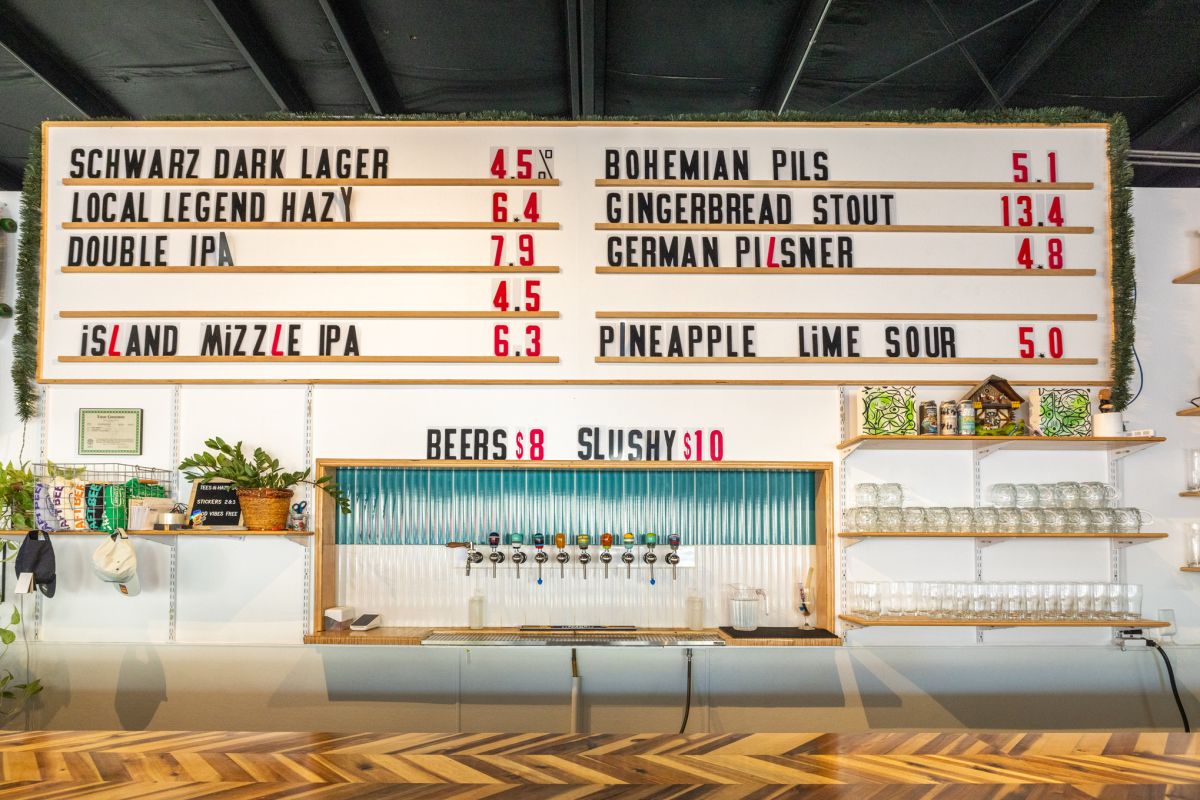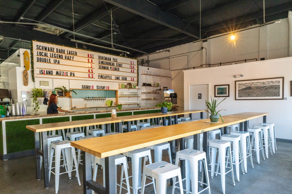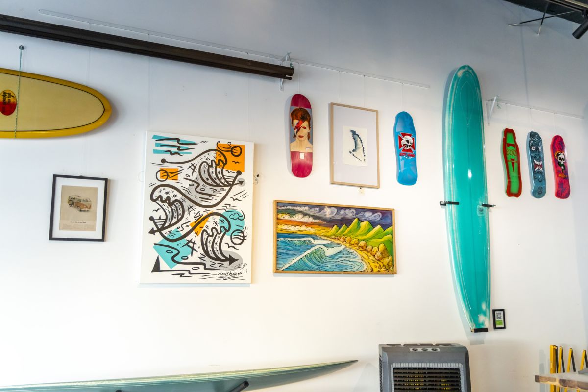 ブレント・クレメンタイン氏によるサーフボードをはじめ、ローカルアーティストたちの作品がいたるところに飾られた店内は、オシャレだけど気取らない空間。おひとりさまでも一見さんでも、リラックスしてのんびりビールを楽しめますよ。