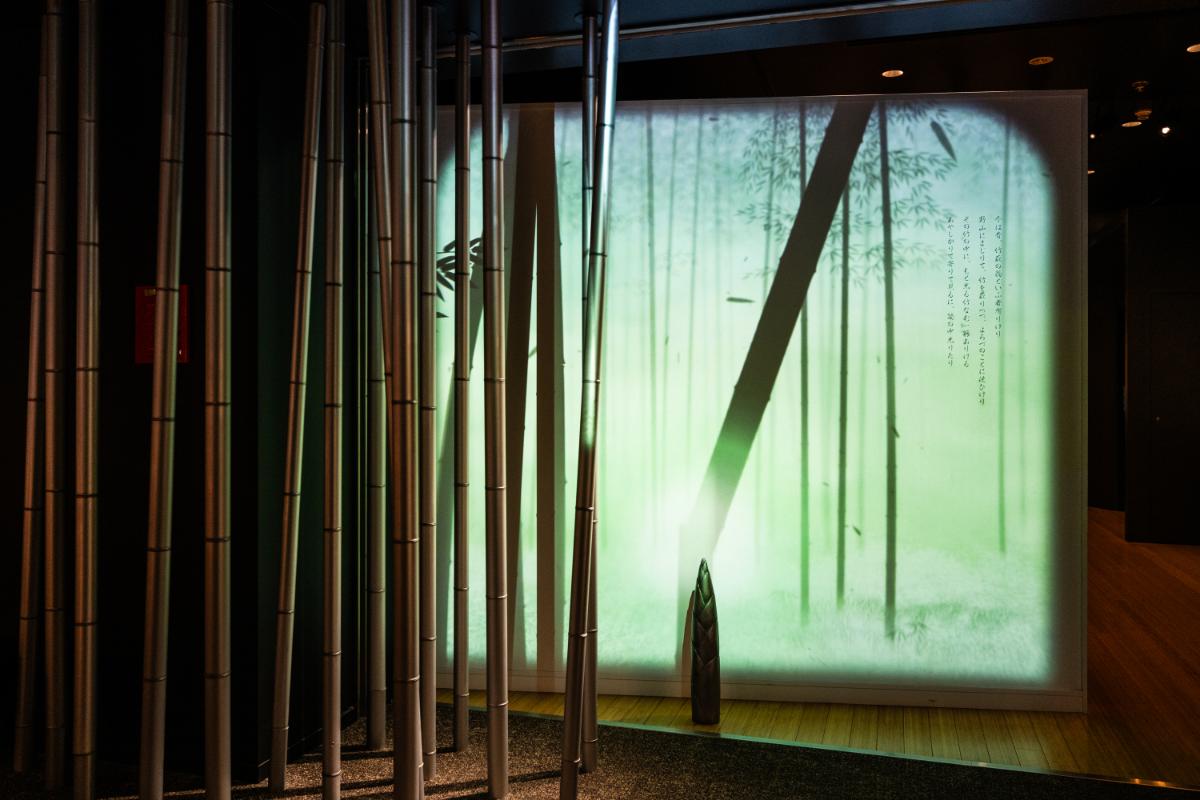 新富士駅から車で約15分の場所にある「富士山かぐや姫ミュージアム」。富士山の南麓では、かぐや姫は富士山の神様であり、月ではなく富士山に帰ったという伝承が残されています。なんとも神秘的な言い伝えを紐解くのがこちらの展示室です。入口では竹取物語の冒頭をプロジェクターで投影した幻想的な映像がお出迎え。