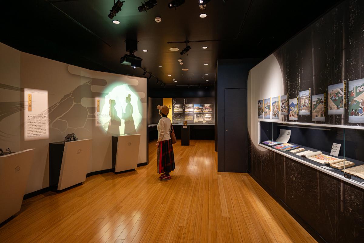 『竹取物語』とは違う、かぐや姫の伝承を影絵で紹介するコーナーも。昔、富士山は神仏が宿る聖なる山として近づく人はいなかったのですが、富士山の神様であるかぐや姫の導きによって登れるようになったというストーリーです。この言い伝えの起源は、富士市にかつてあった密教寺院「東泉院」に伝来した『富士山大縁起』。書物には富士市に今も残る物語ゆかりの地が記され、富士山信仰と深く関わっていたと伝えられています。