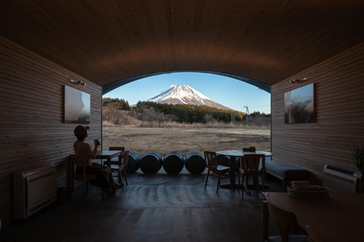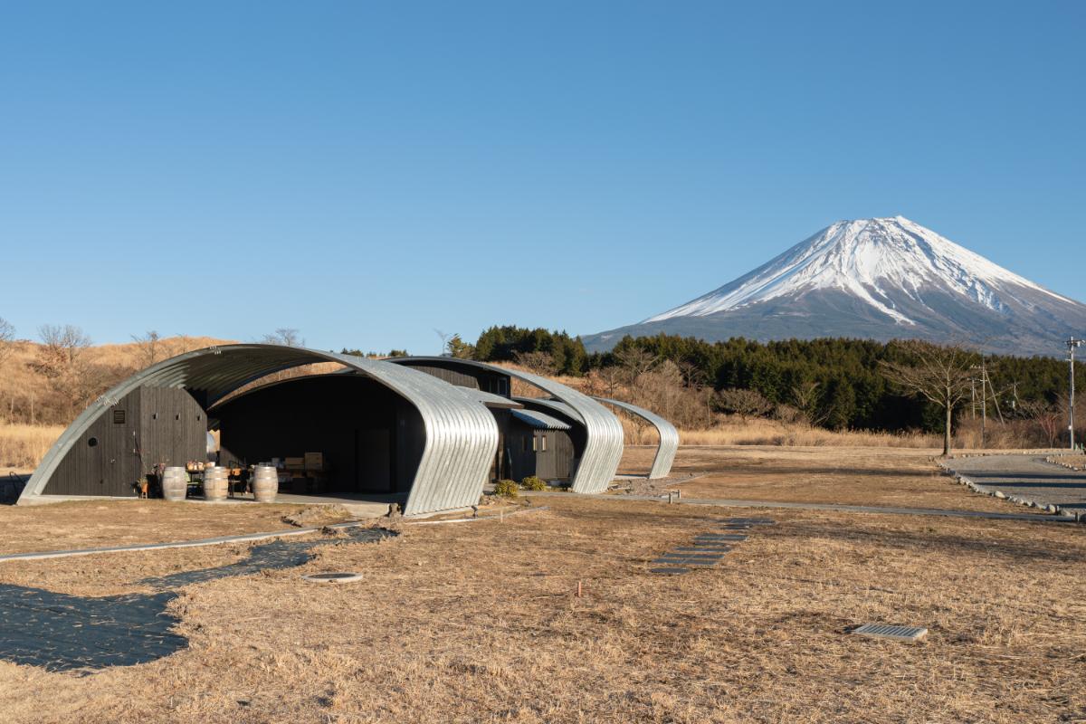 富士山の西麓を走る富士宮道路(国道139号)を北上して約40分、朝霧高原の「Café SHIZEN」にやってきました。ここは2024年7月にオープンした「富士山ワイナリー」併設のカフェ。現代建築家・遠藤秀平氏が手がけた、コルゲート鋼板という建材で曲線を描く屋根は、富士山のシルエットに不思議と馴染んでいます。