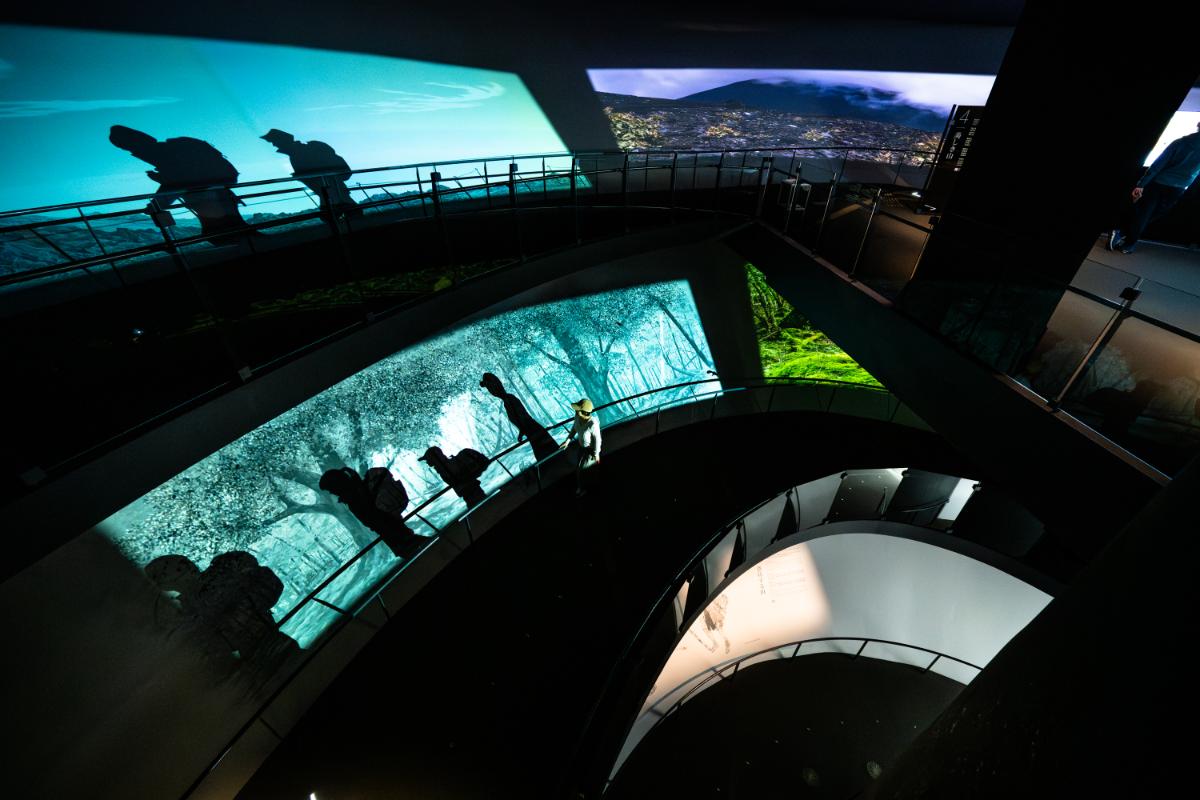 展示棟1階から5階までは、193mのらせんスロープを登ります。壁面に投影されるのは海抜0mから3776mの山頂までの富士登山道の映像。夜景やご来光が見られ、登山者や動物の影と一緒に自分の姿も投影されます。スロープを歩くことで、富士山登頂が簡単に味わえるという仕組みなんですよ。