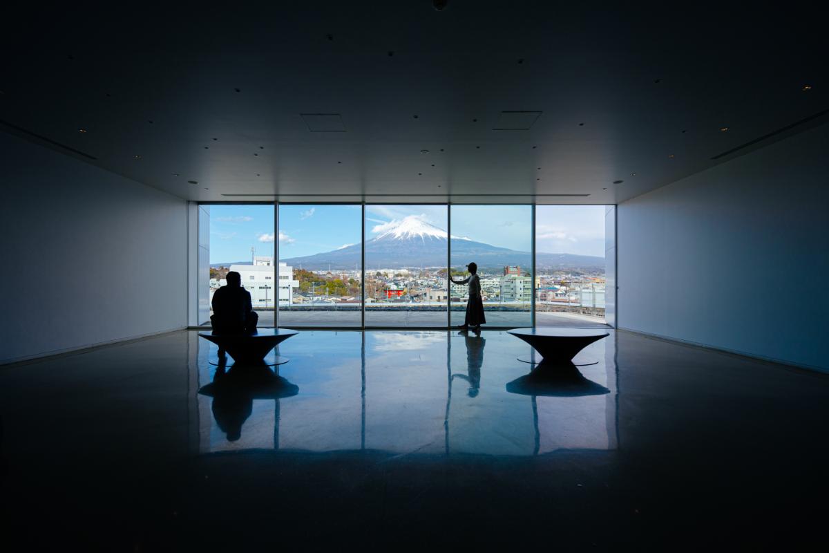 スロープを上りきると、展望ホールからリアルな富士山が一望できて、屋外テラスに出ると富士宮の街並みも見渡せます。ガラス窓の手前には、展示棟と同じ、逆さ富士の形のベンチも。鏡面のような床にミニ富士山が映るのもフォトジェニックです。