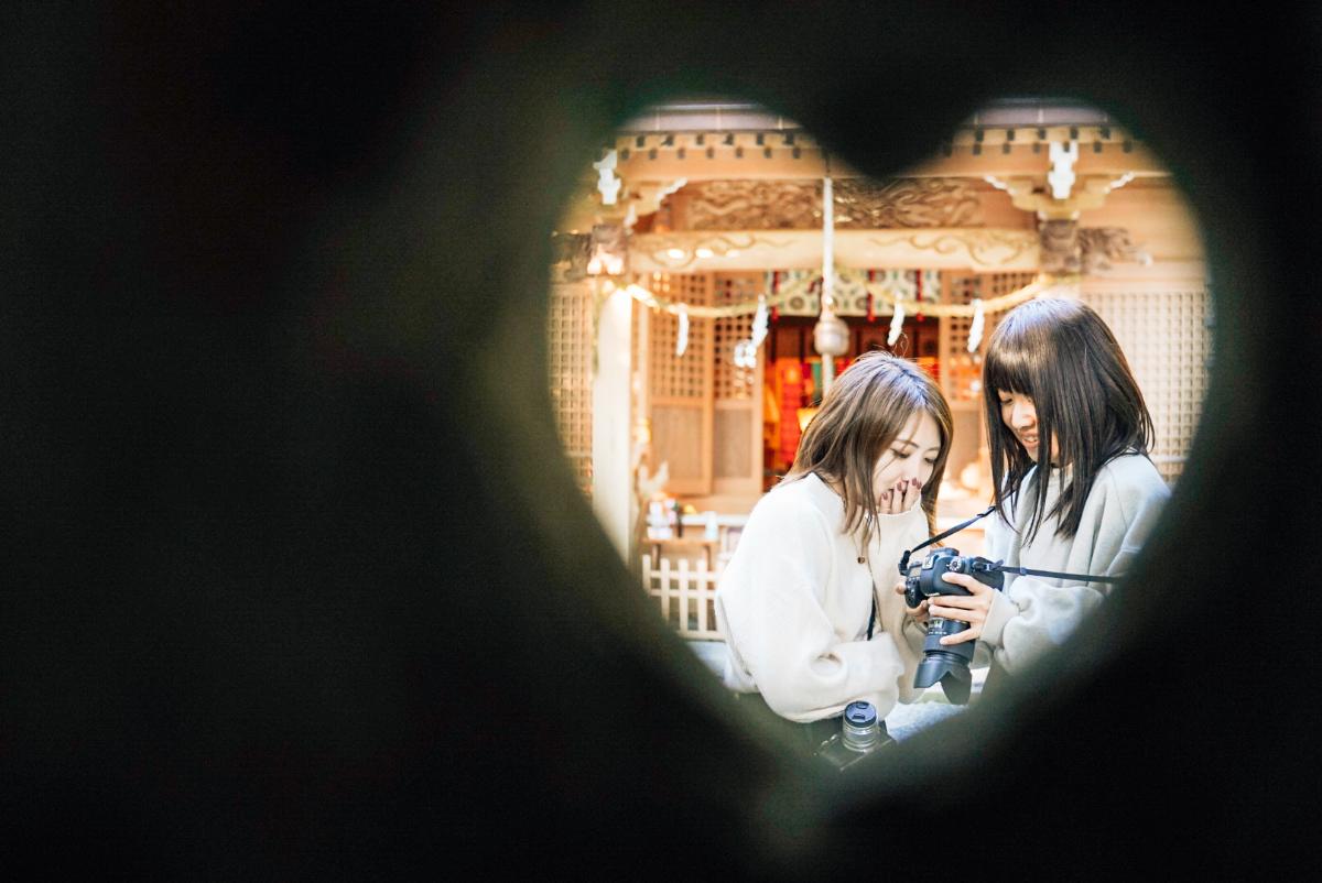 ハートに見えるのは、石灯籠の灯火が入る窓の部分で、魔除けや火除けを意味する猪目(いのめ)模様になっています。窓を覗いて写真を撮ると、拝殿の正面が写るので試してみて。