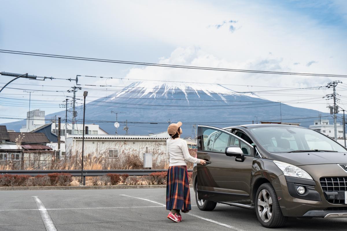 1日目は、美しい裾野を望む富士山の南西から北西の周囲1/4ほどをドライブで回るルート。東京駅から東海道新幹線こだまに乗って、1時間10分ほどで新富士駅に到着。駅周辺のレンタカー営業所で車を借りて、ドライブに出発しましょう。借りた店舗以外で返却できる乗り捨てプランを利用するのが便利です。都内から車で向かう場合は、東名高速・用賀ICから富士ICまで約1時間30分で到着できます。