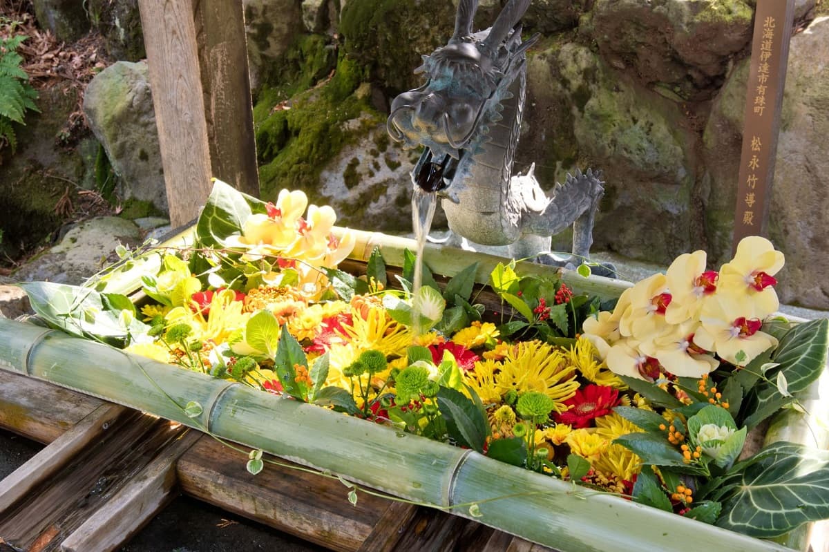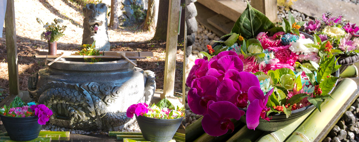 2025年1月25日(土)~2月14日(金)は、龍の口から水が流れる手水舎に花装飾が施されます。手口を清めてから、お参りしましょう。