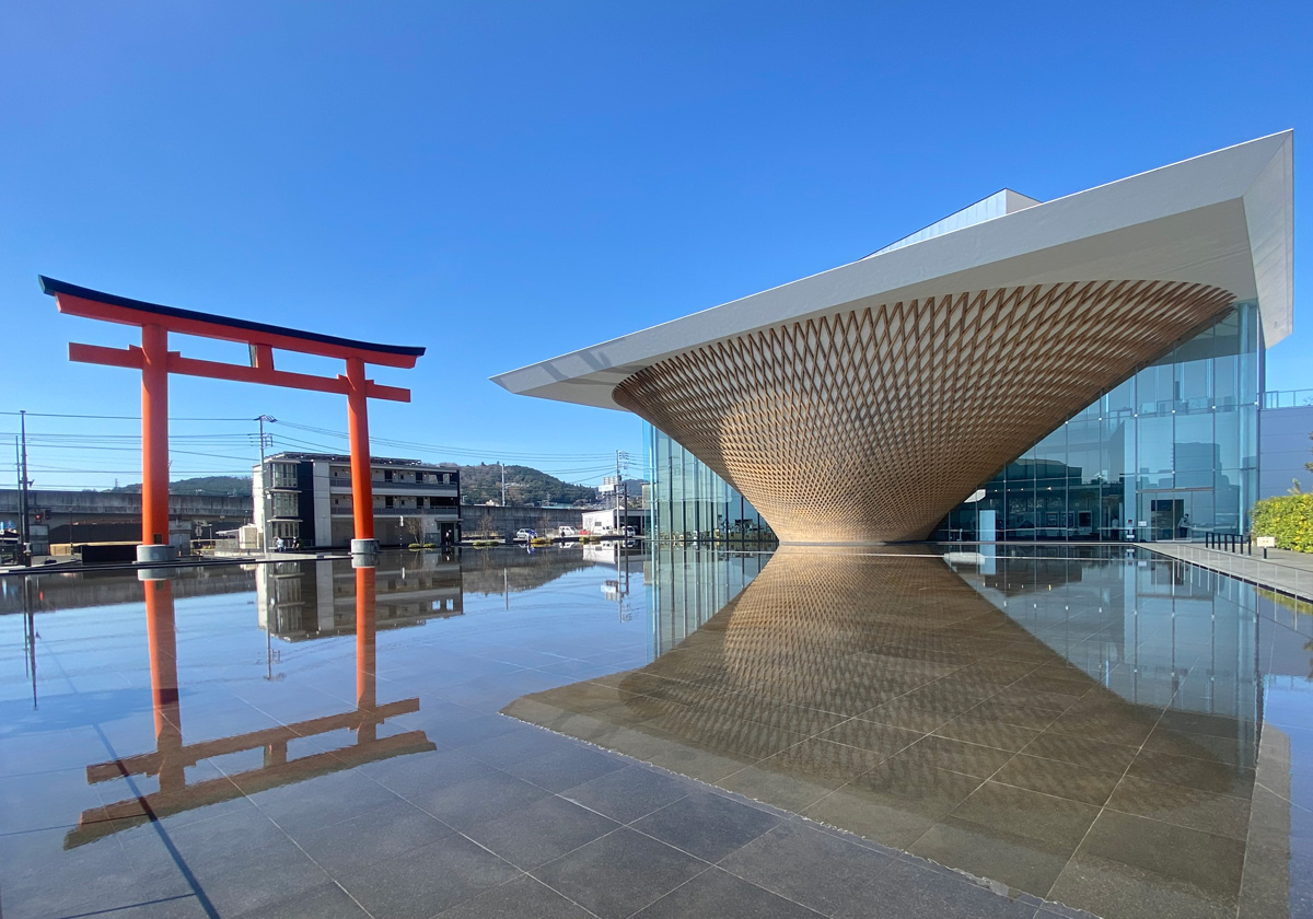 30分ほどドライブして、富士宮市街地に戻ってきました。ここは「富士山本宮浅間大社」の一之鳥居すぐの場所にある「静岡県富士山世界遺産センター」。展示棟は富士ヒノキの木格子で覆われた逆さ富士の形で、湧水を引いた水盤に建物が写り込むと富士山の形が現れるという粋なデザインです。