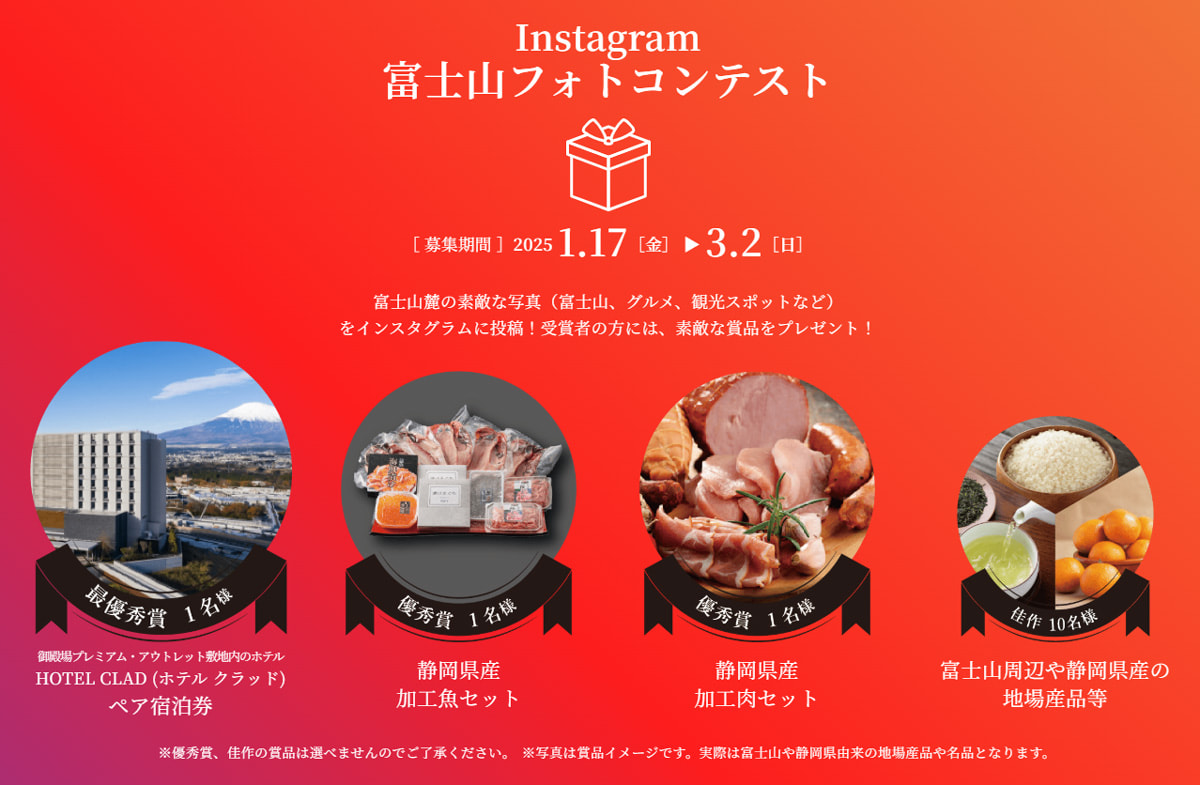 静岡県に出かけて、富士山の景色や世界遺産「富士山」の構成資産、富士山にまつわるスポット、グルメといった素敵な写真を撮ったら、「富士山ぐるっトリップ」公式Instagramに投稿してみて。入賞すると賞品がもらえちゃいます。最優秀賞は、記事内でもご紹介した「HOTEL CLAD」ペア宿泊券です♪