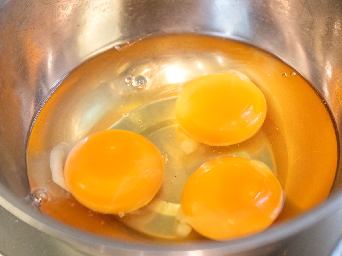 実食の前に、まずは厨房の様子をのぞいてみましょう! 「赤鬼和三盆玉子焼き」1人前につき使用する卵は3個。香川の養鶏場から直送される卵は、黄色みが濃く色鮮やかで味もとても濃厚なのだそう。