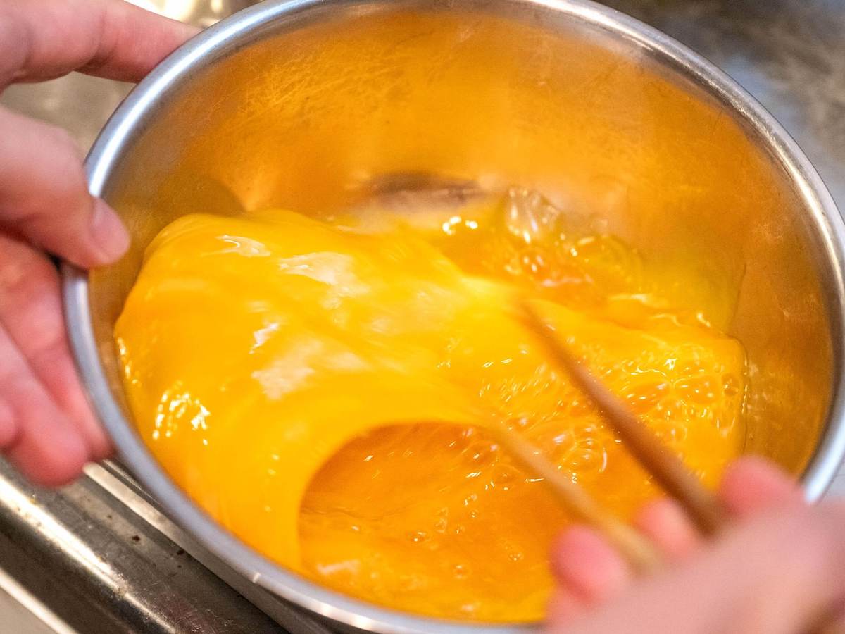 溶いた卵に加えるのは、鹿児島・枕崎産のカツオ節と北海道の利尻昆布を使った一番だし、そして香川県産の和三盆糖、しょうゆ、塩のみ。“素材の味を生かし、シンプルに作ること”がポイントです。