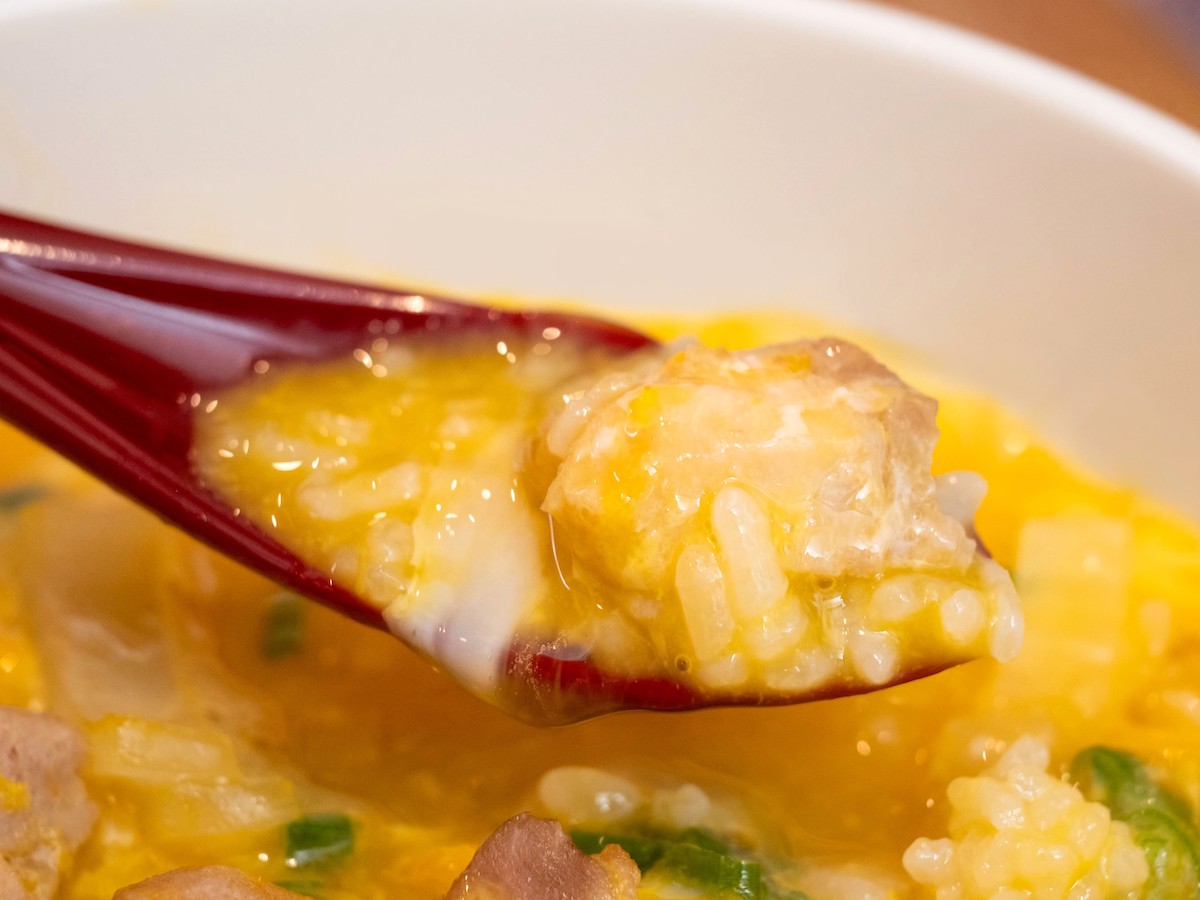 一見“雑炊”のようですが、卵を2個使用しているため、その存在感は抜群。卵本来のおいしさはもちろん、だしのうま味や甘み、卵のとろとろ感が一度に楽しめる唯一無二の親子丼です! 一度口にしたら何度でもリピートしたくなる新感覚の味。