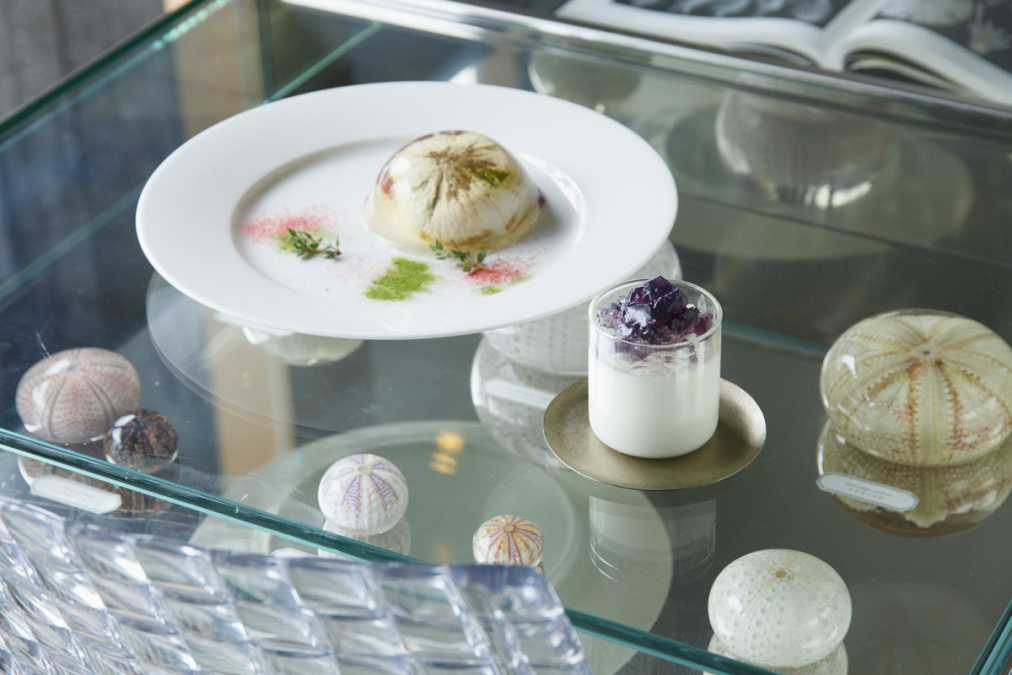 水晶の中に庭園のような景色が広がる鉱石を、透明なアマレットのゼリーといちご風味を効かせたティラミスで再現しています。不思議な浮遊感のある一皿です。
