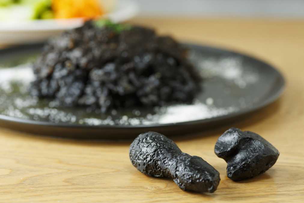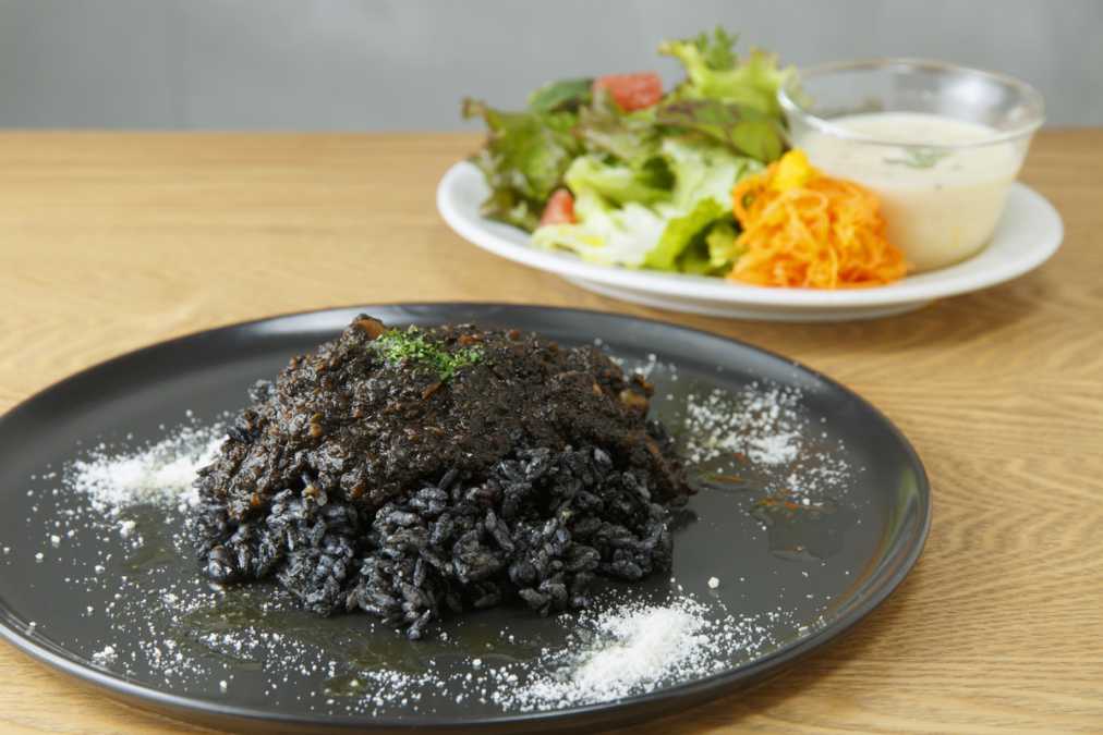 「隕石カレーセット」1080円は、黒すぎるビジュアルが衝撃的。「隕石が衝突するときに生まれる物質『テクタイト』の色や質感をドライカレーで表現しました」と吉村さん。見た目と違って味は抜群。野菜の甘さやコク、ピリリと刺激的なスパイスのハーモニーがたまりません。