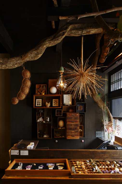 吉村さんが「自然界の美しいものを集めた」というショップは、どこかノスタルジックな雰囲気。床から天井まで大きな木の枝が張り巡らされ、世界最大の豆であるモダマや鹿の頭骨、アンモナイトや蛍石など、誰もが少年少女の頃に憧れた宝物たちがそっと並べられています。