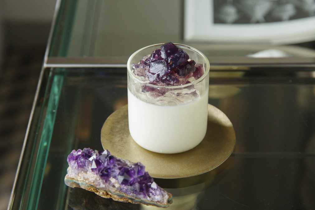 ぶどうゼリーを結晶に見立てた「アメシスト パンナコッタ」も美しい。こちらは、ランチセットを選んだ人だけがオーダーできるスペシャルメニューです(+324円)。