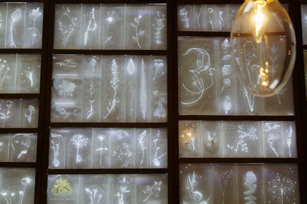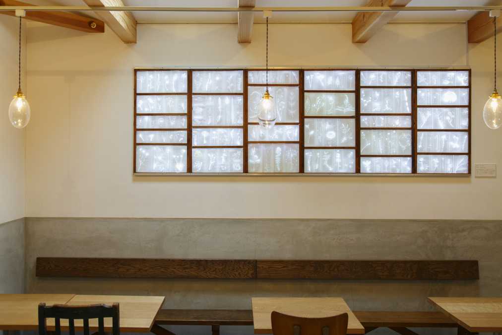 壁の大きなガラス作品は、アーティストの佐々木類さんによるもの。瀬戸内の島で採集した植物がシルエットのように浮かび上がり幻想的です。