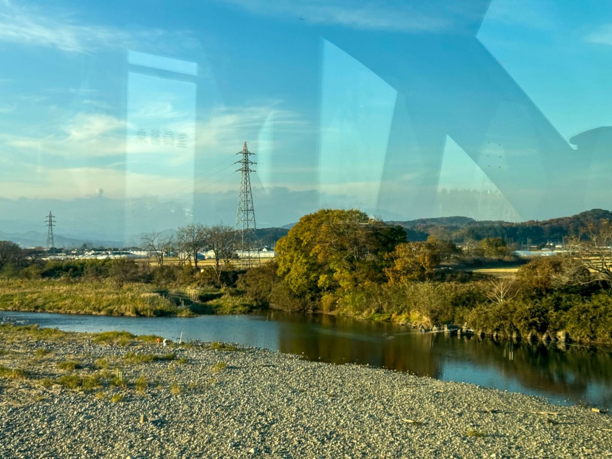 各座席の横にも大きな六角形の窓があり、川や山々など自然をたっぷり楽しみながら東京の浅草から鬼怒川へ移動することができます。車窓からは東京スカイツリー(R)も望めて、絶景でした。