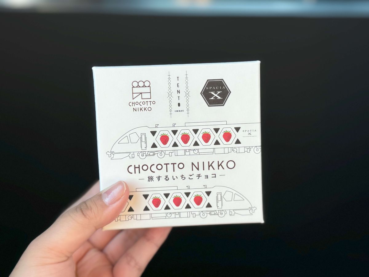 今回は「旅するいちごチョコ」1600円を食べました。日光にある人気の和風チョコレート店「TENTO chocolate」とのコラボ商品で、パッケージにはスペーシアXとイチゴが描かれていてかわいい。