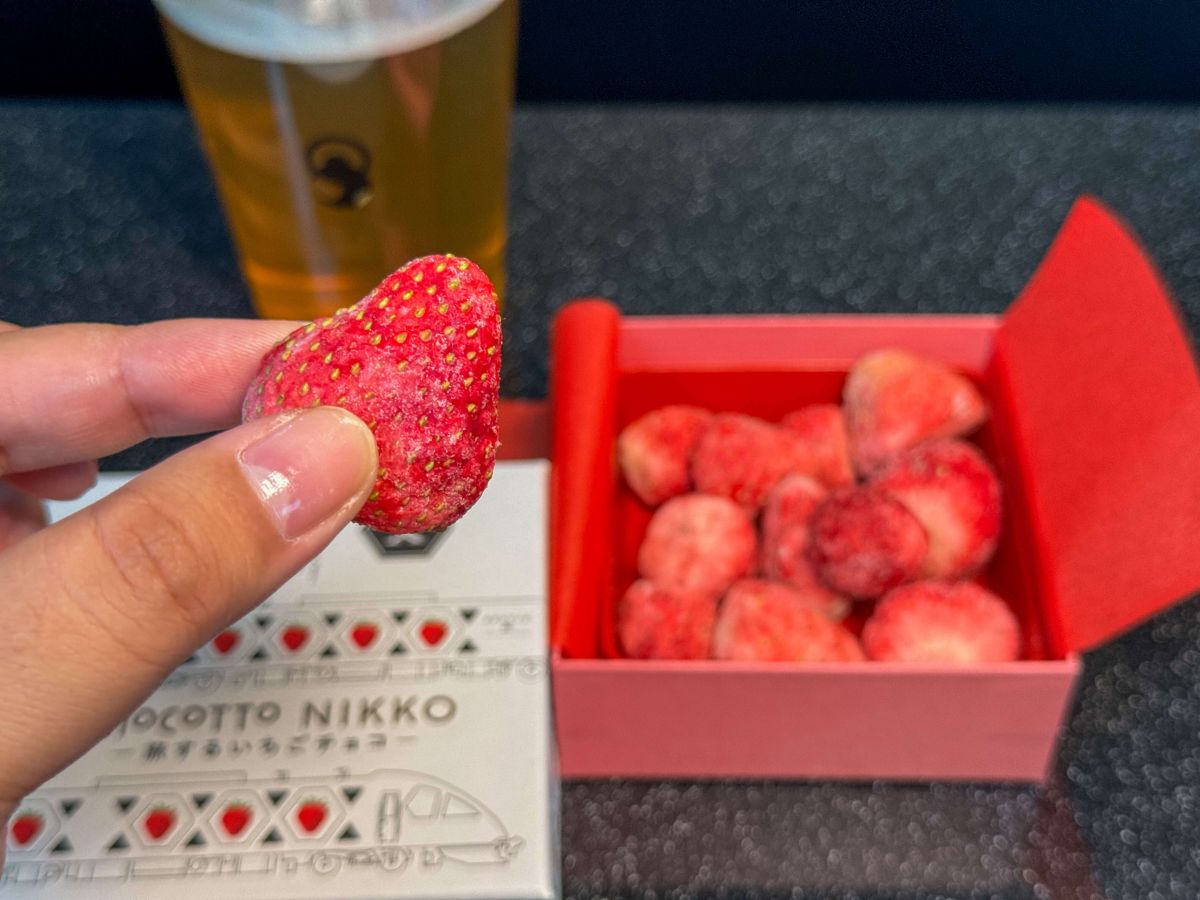 とちおとめにホワイトチョコレートをたっぷり染み込ませたお菓子で、イチゴの酸味とチョコレートの甘みが絶妙に合わさりビールにもぴったりでした。