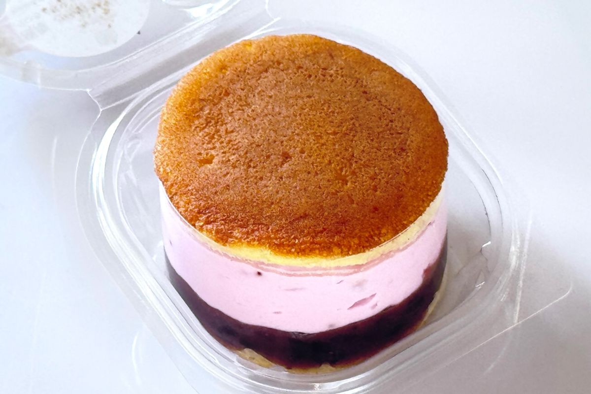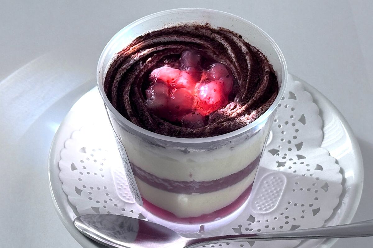 透明の容器からは、4層になった側面と、赤いいちごのソースが見えます。