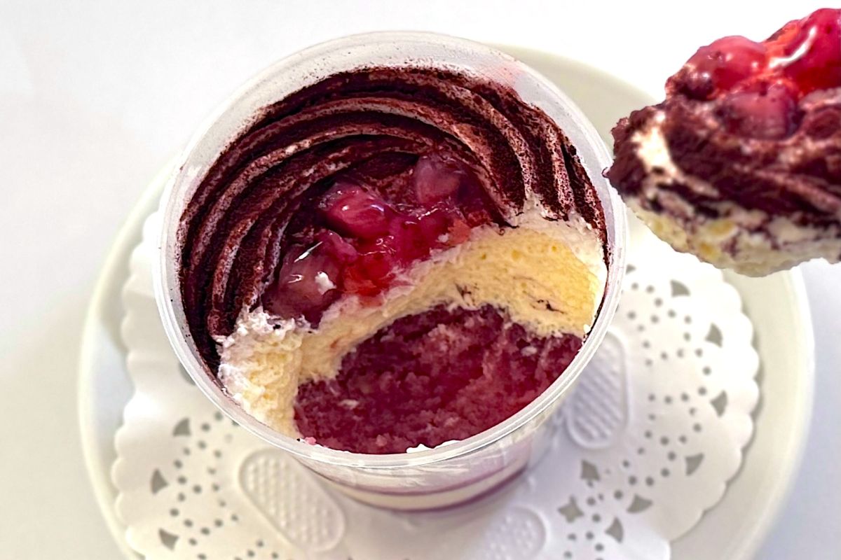 食べすすめていくと、中間層にはシロップをジュワッとしみ込ませたいちご味のスポンジ、一番下からは果肉入りのいちごソースも登場。 少しずつ味わいを変えながらも、終始、甘ずっぱくてフレッシュ感のあるいちごとマスカルポーネチーズのハーモニーが楽しめます。