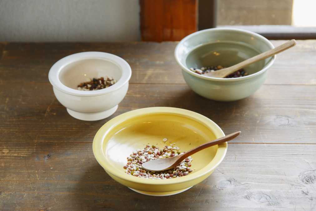 吉野「いにま陶房」の”やさしい器”シリーズ。スプーンですくいやすいフォルムで、手が不自由な方や子どもたちにもおすすめだそう。焼きものはほかに、宇陀の尾形アツシさんを扱います。