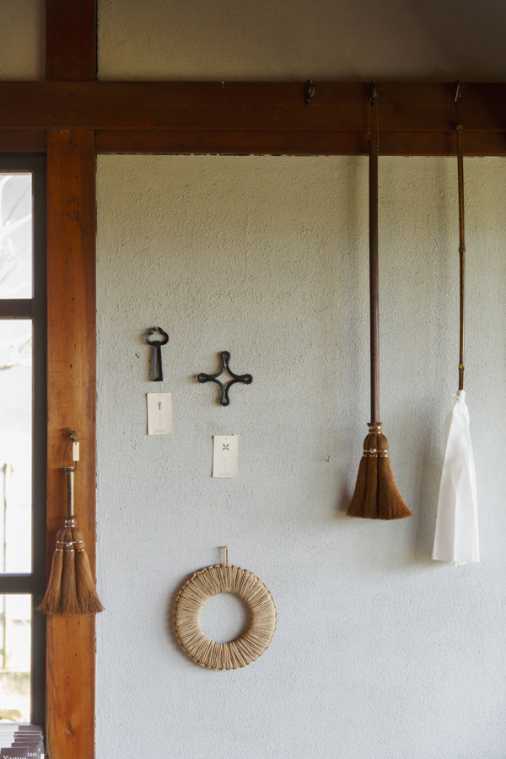栓抜き、鍋敷き、小箒など、壁にかけて収納しておくだけでも絵になる道具たち。右端は、ほこりをぬぐう力が抜群の羽二重正絹のハタキ(1620円)。