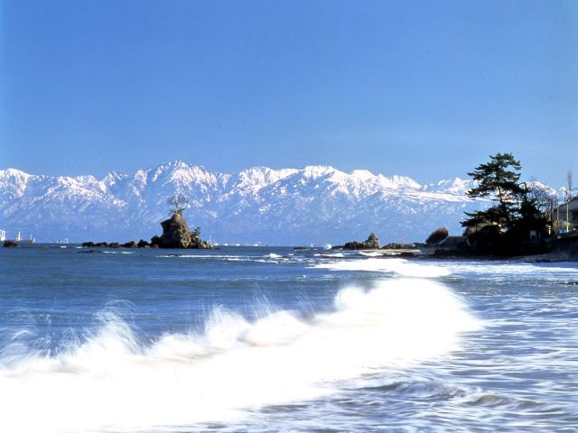「日本の渚百選」に選ばれた「雨晴海岸(あまはらしかいがん)」。雨晴駅近くの義経岩は、源義経が奥州へ落ちのびる途中に雨宿りしたという伝説があり、地名「雨晴」の由来となっています。晴れた日には海越しに3000m級の立山連峰を望む絶景に出合えますよ。また、有磯海は『おくのほそ道』の風景地として、国の名勝に指定されています。