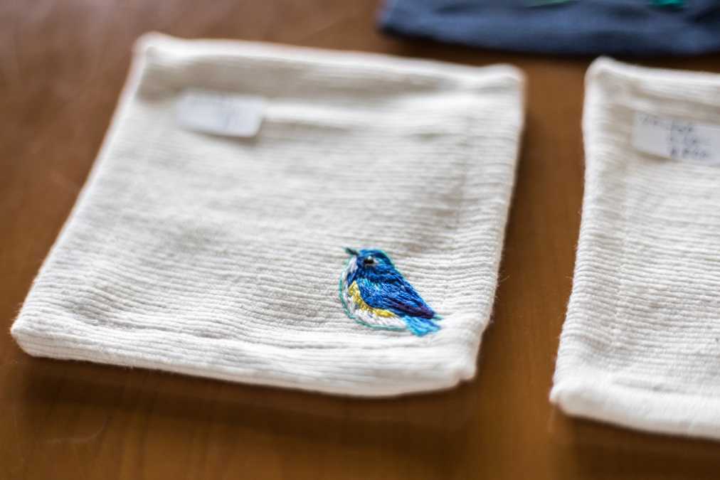 お店で販売されている手刺繍のコースター。スタッフが茂庵で出会った野鳥を刺繍しているそうです。こちらは野鳥ファンに人気のルリビタキ。運が良ければ、裏のつくばいで水浴びしている様子も見られるとのこと。