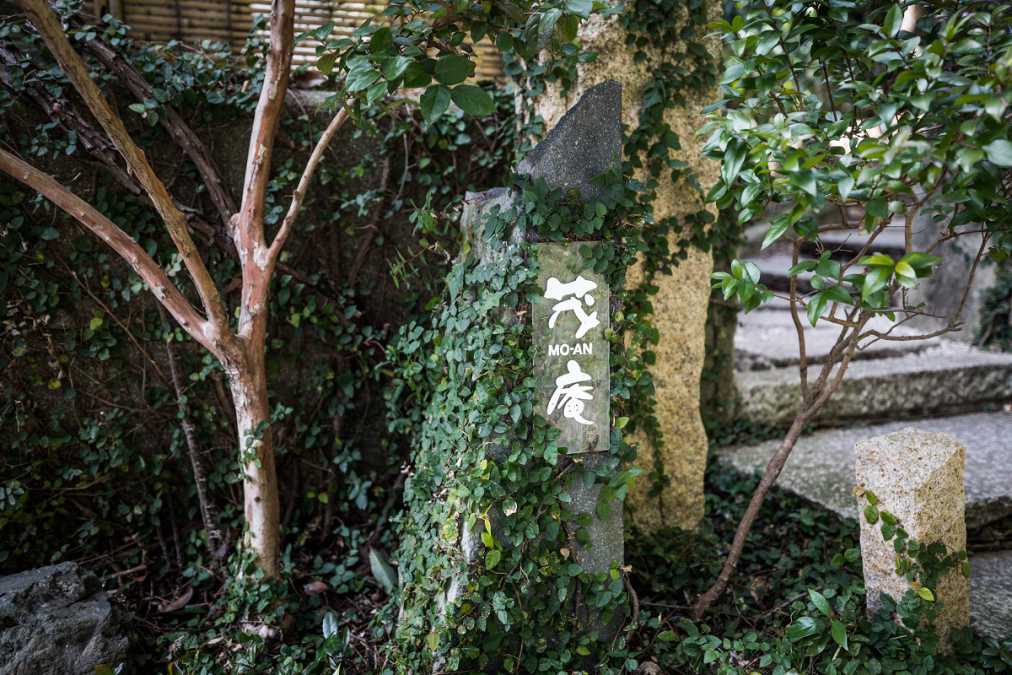 ところどころに現れる案内板を目印に。階段を登ると緑と同化しつつある茂庵の看板が見えてきました。