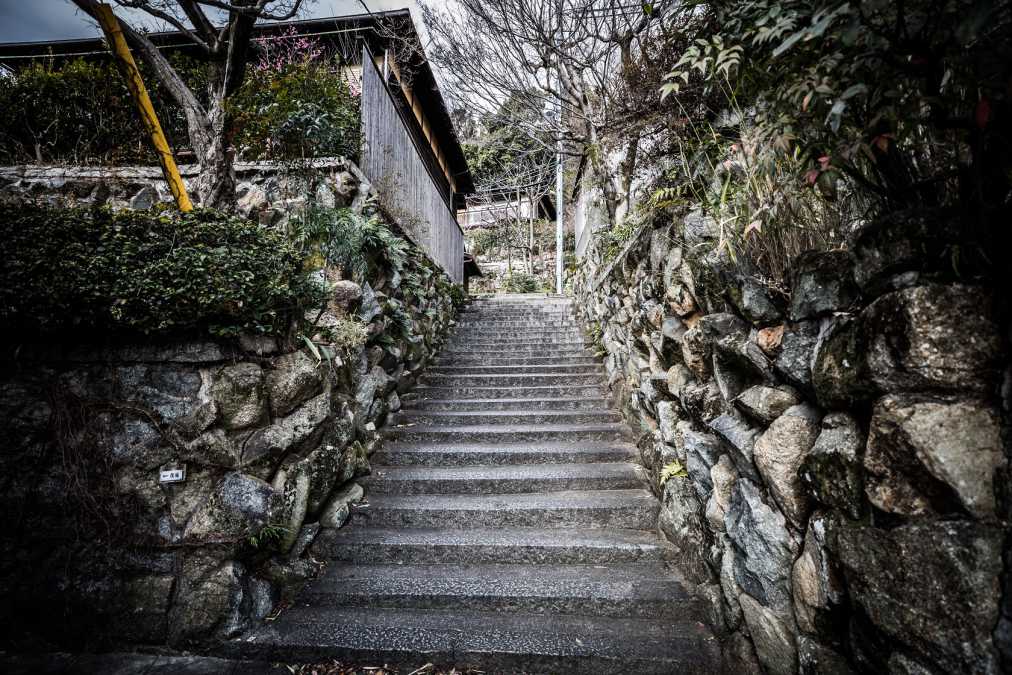 昔ながらの住宅街。石垣の間の階段も石でできています。