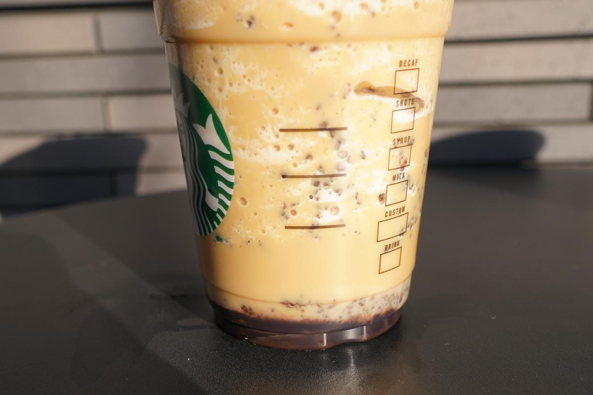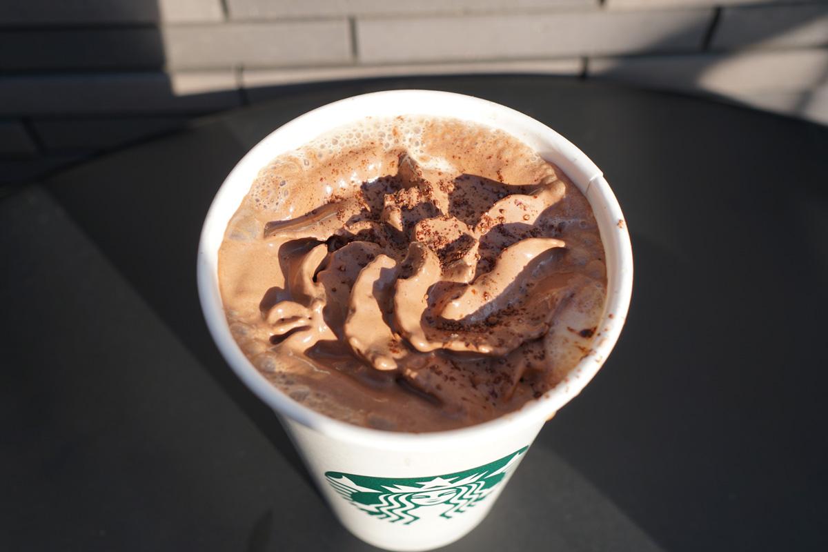さらにカカオ感を加えたいなら、ダークチョコレートパウダー多め(無料)にしてみてはいかがでしょうか。今回試してみたところ、ビターな風味がUP! とっても濃厚で大人味のフラペチーノに。