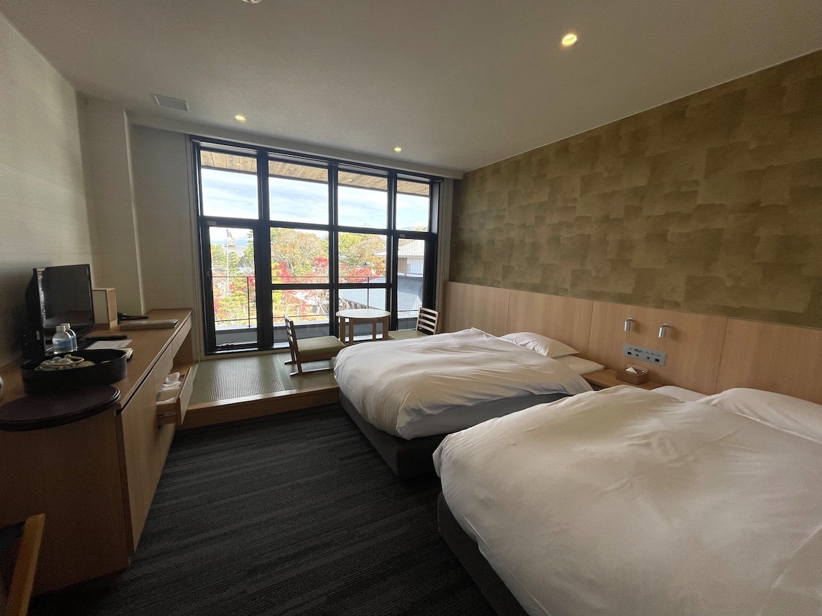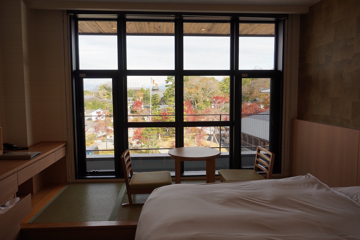 北向きの客室は境内側で、窓からは境内が見わたせます。伽藍のほか、春は桜や青紅葉、秋は紅葉と、季節ごとに美しく移り変わる境内の景色が楽しめます。南向きの客室からは、京都の町並みを見ることができます。