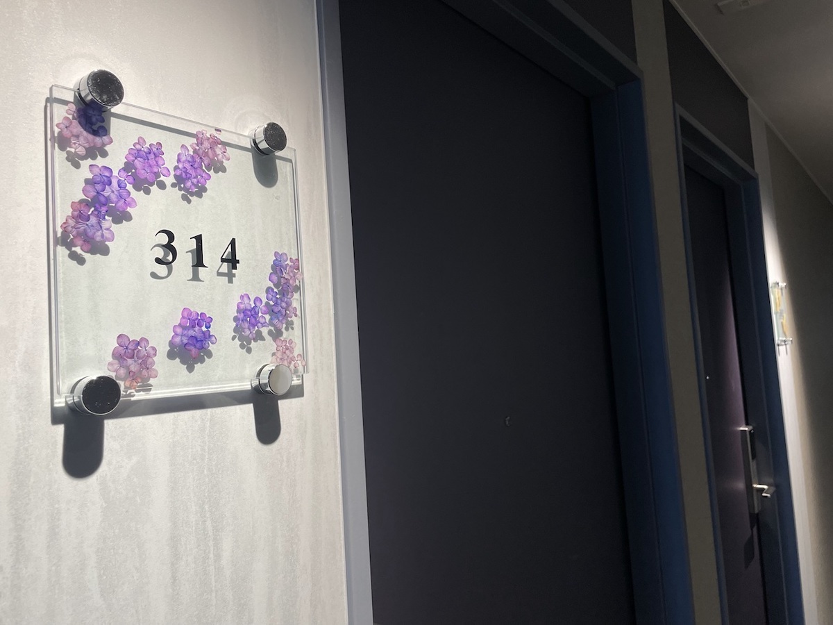 各部屋のルームプレートには、智積院の境内で見られるアジサイの花や、イチョウの葉、クローバーなどの押し花があしらわれています。かわいくて、ほっと心が癒やされます。