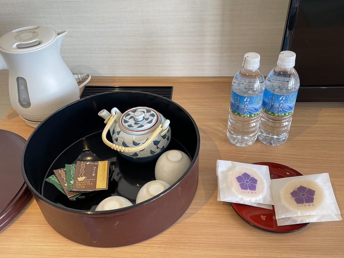 客室には、お茶菓子やティーパック、ミネラルウォーターなどが用意されていて、ほっこりとお茶を楽しむことができます。部屋着用の作務衣も備えられています。歯ブラシやヘアブラシ、スキンケアセットなどのアメニティは、フロントで受け取るスタイルです。アイロンやアイロン台、充電器や加湿空気清浄機などの無料貸し出しもあり、至れり尽くせり。