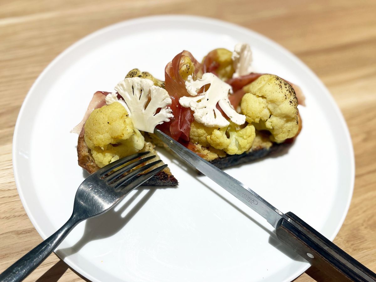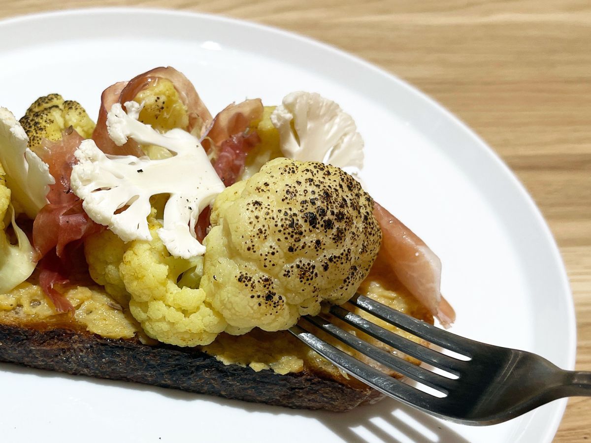 冬季シーズンメニューの「パン オ ルヴァンのタルティーヌ カリフラワーとハモンセラーノ」は、冬が旬のカリフラワーをふんだんに使用したタルティーヌ。
