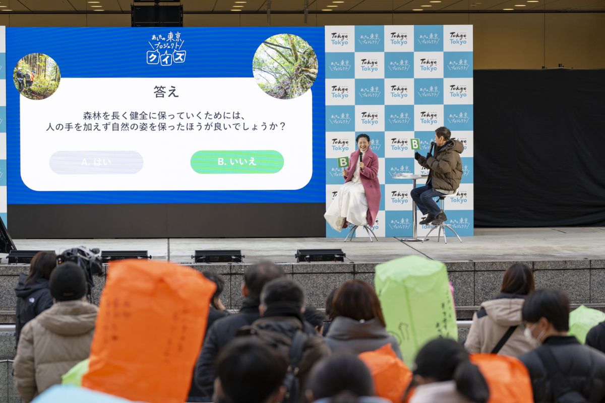 トークショーでは、「多摩フォレストツーリズム」や「神津島サステナブルツーリズム」の振り返りとなるクイズが出題され、勤さん、麻里さんともに大健闘! 例えば「森林を長く健全に保っていくためには、森林に手を加えず自然の姿を守った方がいい。『はい』『いいえ』のどちらでしょう?」というクイズでは、お二人そろって「いいえ」を選択し、正解を獲得しました。ちなみに森林は、適切な伐採などが行われることで、健全な状態が保たれるのだそうです。