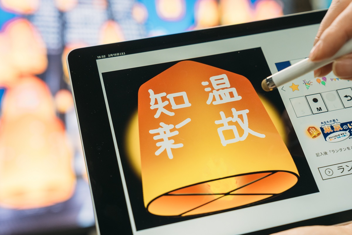 会場には、デジタルランタンが楽しめるブースも。ここでは、ブースで貸し出されるタブレットにデジタルペンを使って東京の魅力や未来への願いを記入します。記入後、タブレット上でランタンを打ち上げると、ブース内に設置されたスクリーンに、たった今打ち上げたランタンが登場し投影されます。