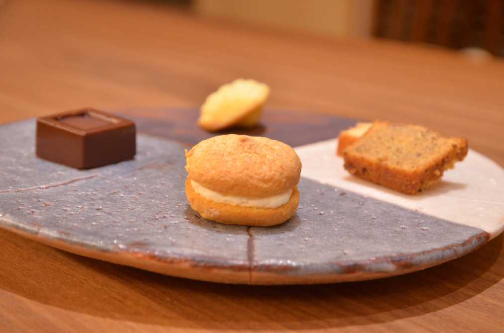 最後は、3つの焼き菓子と生チョコレートの贅沢なひと皿。生チョコレートにはシャンパンが練りこまれ、甘さとともにシャンパンの香りが口中に広がります。