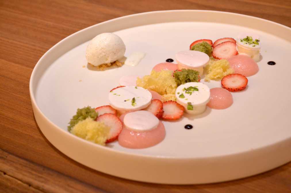 続いてメインディッシュ。7種類のパーツで構成された苺のショートケーキは、まさに「未完」そのものです。鮮やかな苺は奈良県さんの「飛鳥ルビー」。ピスタチオといちごのメレンゲ、ミルクのジェラードに苺の生搾りエスプーマ…さまざまな味が口のなかで融合し、ショートケーキが完成します。自然の素材がもつ色、風味だけを生かした味は、舌に幸せな記憶を創ってくれます。