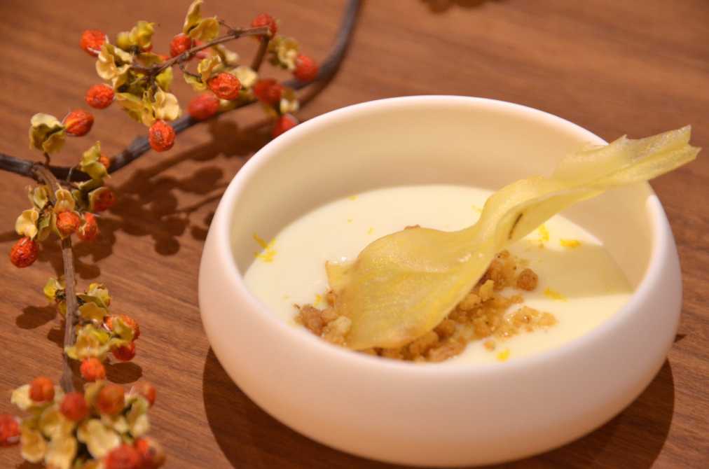 北海道産のゆり根を真っ白になるまで剥き、隠し味のハチミツと塩だけで素材の甘さを引き出したゆり根のスープ。スープのうえには、山椒を隠し味にしたシュトロイゼルがたっぷり。サクッとした舌ざわりと不意をつく甘み。おろしたての柚子の皮の香りが心をすっとほぐしてくれます。