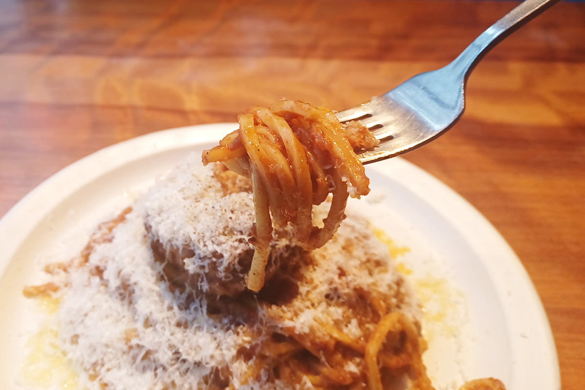 セレクトしたのは大人気の「国産牛のボロネーゼ」。パスタの上にハンバーグとチーズがトッピングされたボリューム満点の一皿です。