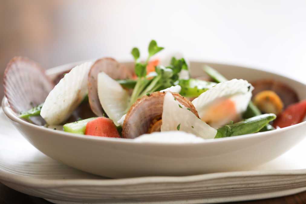 具沢山!「殻付きミニホタテとアスパラの酒蒸し」280円。見た目の美しさが食欲をそそります。塩分のきつすぎない絶妙な味付け、野菜もたっぷり入っているところがヘルシーで嬉しい。