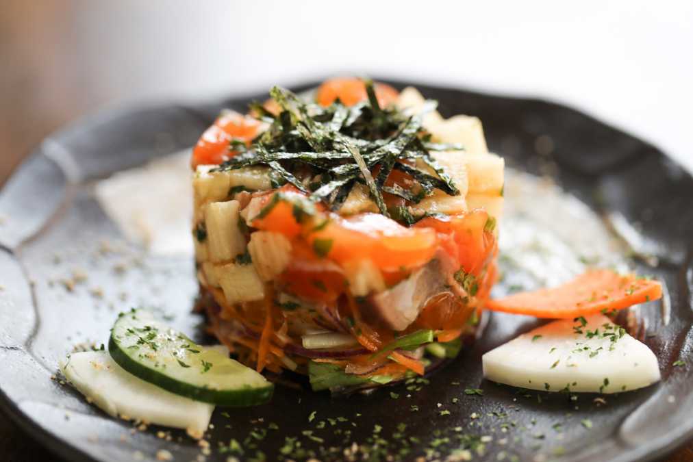 見た目も美しいこちらは「サーモンと山芋のタルタル」250円。ユッケ風に味をつけたサーモンと山芋、旬野菜を彩りよく混ぜ合わせてまるく型抜きして可愛く仕立ててあります。ワインや日本酒にもよく合うテンションのあがる一品。