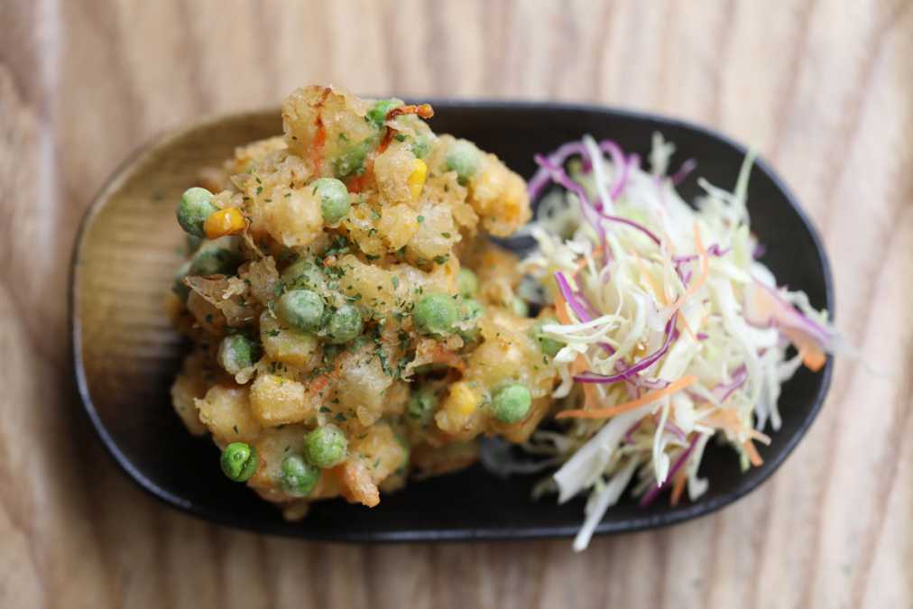 こちらは「季節野菜のかきあげ」180円。とうもろこしやグリーンピースなど旬の野菜がたっぷりはいってサックサクの食感。小腹な女子なら2人でシェアするのにちょうどよいポーションが嬉しい!