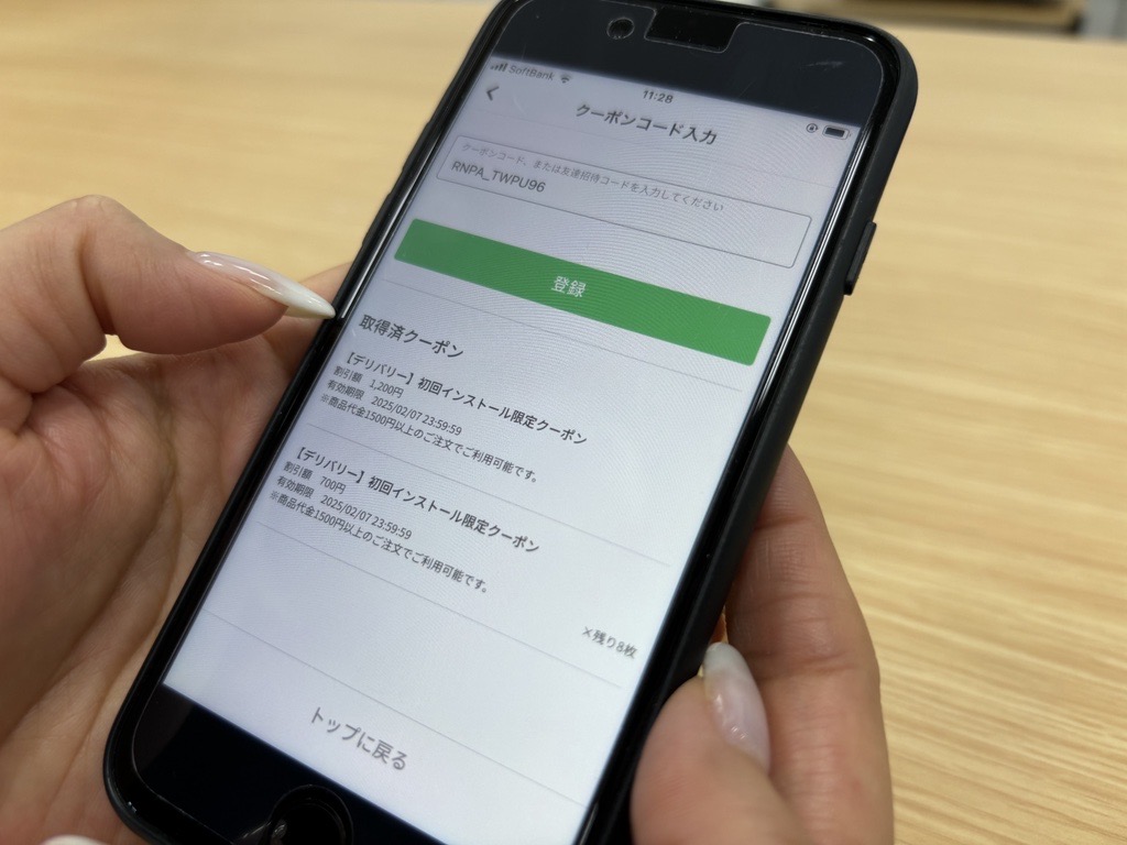 オーダーする前に事前にクーポンをアプリ内に登録しましょう。トップ画面から右上の「マイページ」を開きます。「クーポンコード入力」をタップして、コードを登録すれば完了。クーポンはオーダーするレストランと商品を選べば自動的に適用されます。